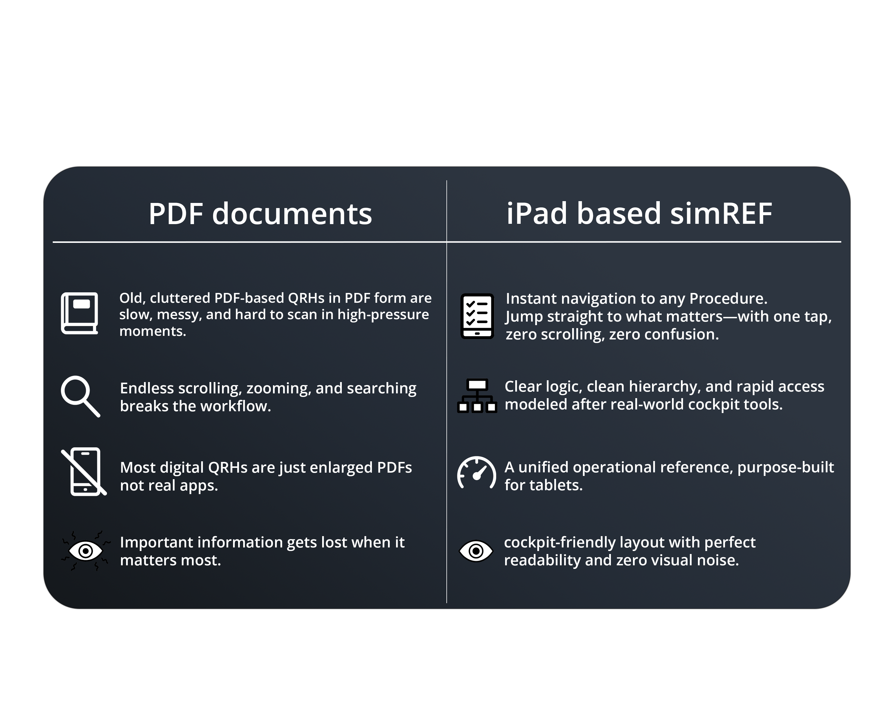 Designed in collaboration with enthusiasts, student pilots and real-world pilots, simREF follows the logic, structure and workflow of a true QRH — without compromising usability for flight simulation.