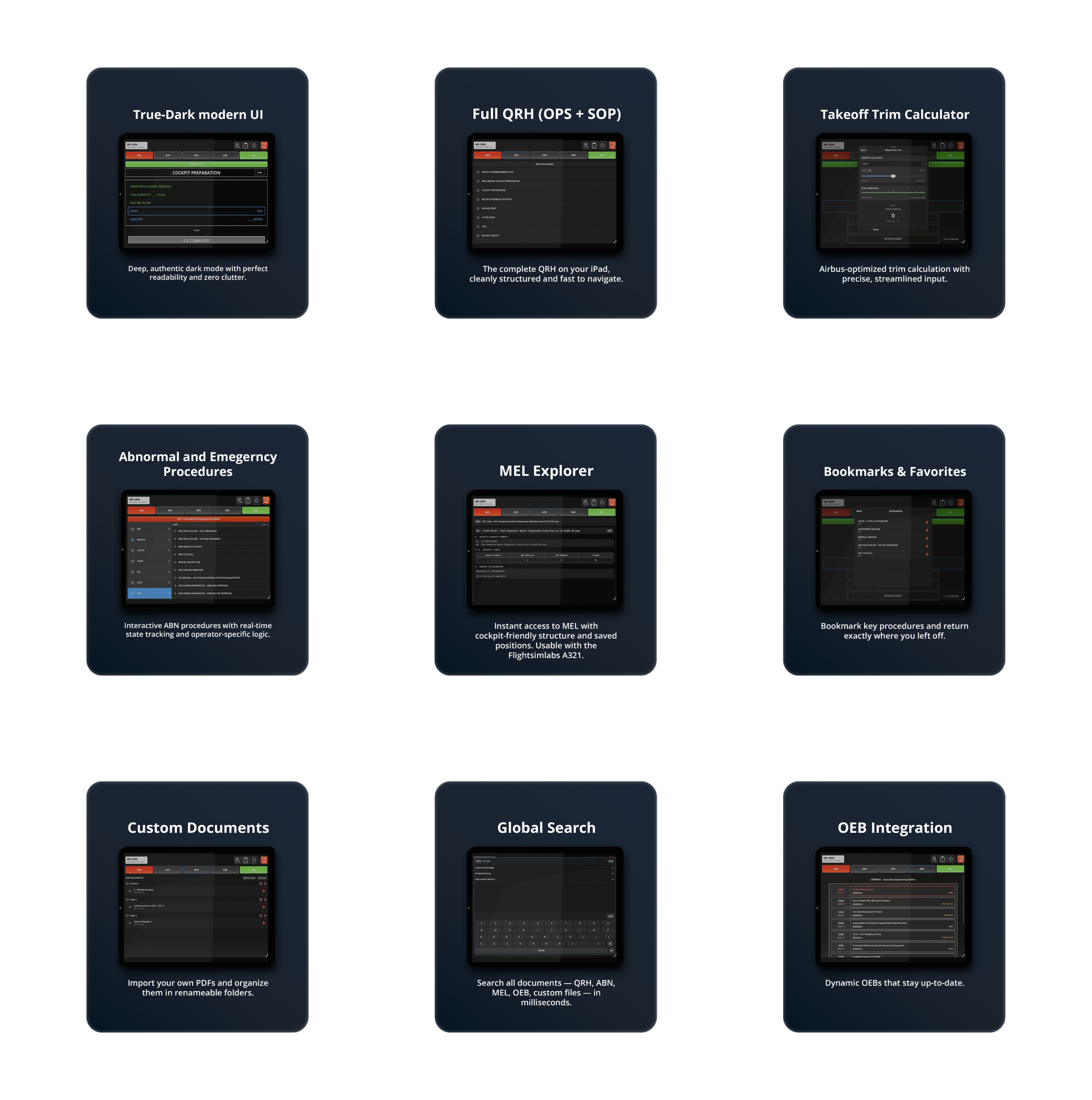 Designed in collaboration with enthusiasts, student pilots and real-world pilots, simREF follows the logic, structure and workflow of a true QRH — without compromising usability for flight simulation.